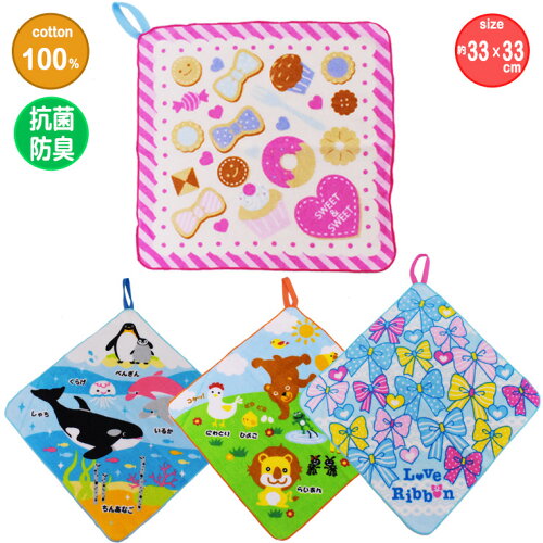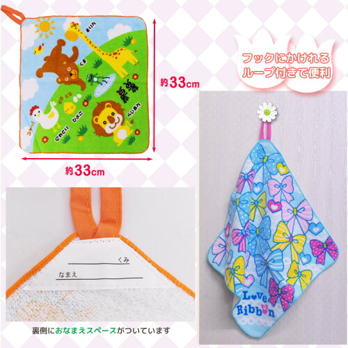 ループ付きタオル (No.5) 38836 ループタオル 紐付きタオル ループタオル 男の子 女の子 保育園 幼稚園 入園 入学 タオルハンカチ ハンドタオル キッズ タオル 保育園 入園準備 タオル ループ 綿100% 抗菌 防臭 タオル キッチン どうぶつ スイーツ リボン 知育(03533)