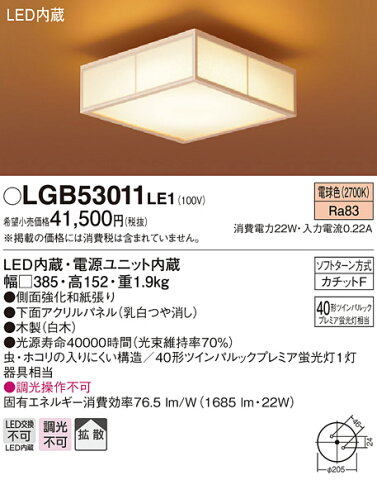 商 品 詳 細商品名インテリア 屋内 照明メーカー名パナソニック Panasonicメーカー器具名称和風照明仕様商品詳細光源◆LED(電球色タイプ) ◆色温度:2700 K ◆光源寿命40000時間(光束維持率70%)寸法・質量◆幅:□385 mm ◆高:152 mm◆質量:1.9 kg仕様・注意事項LED照明の安心品質◆器具光束:1685 lm ◆電圧:100 V ◆消費電力:22 W ◆消費効率:76.5 lm/W◆デザイン分類:数寄屋◆【下面アクリルパネル】乳白つや消し◆【木製】白木◆Ra83◆虫・ホコリの入りにくい構造◆40形ツインパルックプレミア蛍光灯1灯器具相当◆入力電流(100V時):0.22 A◆調光操作不可注意事項◆写真方向以外取り付け不可 ※施工・電気工事は専門業者にご依頼ください。