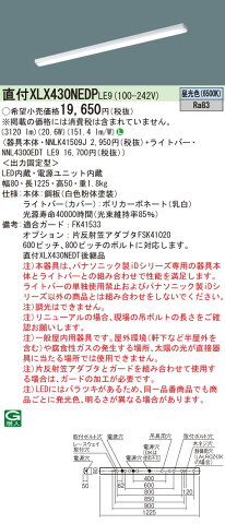商 品 詳 細商品名インテリア 屋内 照明メーカー名パナソニック Panasonicメーカー器具名称施設・店舗照明仕様商品詳細光源◆LED(昼光色) ◆色温度:6500 K ◆光源寿命40000時間(光束維持率85%)寸法・質量◆幅:80 mm ◆長:1225 mm ◆高:50 mm◆質量:1.7 kg仕様・注意事項LED照明の安心品質◆器具光束:3120 lm ◆安定器出力型:定格出力型 ◆安定器補足:<出力固定型> ◆電圧:100〜242 V ◆消費電力:20.6 W ◆消費効率:151.4 lm/W◆【本体】鋼板(白色粉体塗装)◆【ライトバー(カバー)】ポリカーボネート(乳白)◆Ra83【適合ガード】FK41533◆600ピッチ、800ピッチのボルトに対応します。